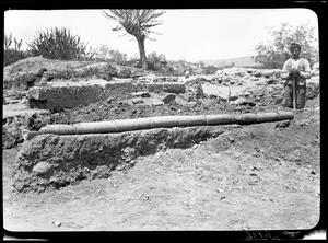 Part of the collection of images, 1906-1910, of the British School at Athens excavations at Sparta, Laconia. The original description in the SPHS register reads: "Sparta: Orthia, drain pipe in arena".