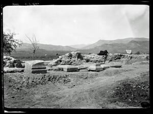 Part of the collection of images, 1906-1910, of the British School at Athens excavations at Sparta, Laconia. The original description in the SPHS register reads: "Sparta: Orthia, front of temple & Roman pavement".