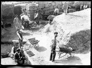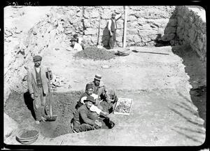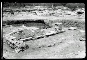 Part of the collection of images, 1906-1910, of the British School at Athens excavations at Sparta, Laconia. The original description in the SPHS register reads: "Sparta: Orthia, excavation round archaic altar".