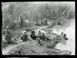 Part of the collection of images, 1906-1910, of the British School at Athens excavations at Sparta, Laconia. The original description in the SPHS register reads: "Sparta: Orthia, women washing".