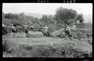 Part of the collection of images, 1906-1910, of the British School at Athens excavations at Sparta, Laconia. The original description in the SPHS register reads: "Sparta: Orthia: raising inscribed base".