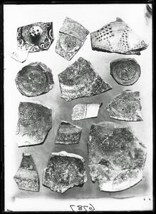 Part of the collection of images, 1906-1910, of the British School at Athens excavations at Sparta, Laconia. The original description in the SPHS register reads: "Sparta: Vases. Byzantine pottery".