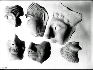 Part of the collection of images, 1906-1910, of the British School at Athens excavations at Sparta, Laconia. The original description in the SPHS register reads: "Sparta: fragments of masks".