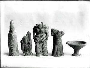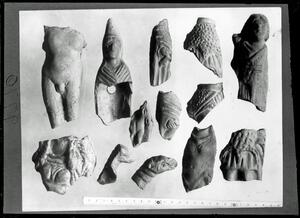 Part of the collection of images, 1906-1910, of the British School at Athens excavations at Sparta, Laconia. The original description in the SPHS register reads: "Sparta: Orthia, terra cottas".