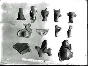 Part of the collection of images, 1906-1910, of the British School at Athens excavations at Sparta, Laconia. The original description in the SPHS register reads: "Sparta: Orthia, geometric bronze animals".