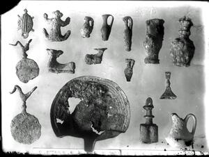 Part of the collection of images, 1906-1910, of the British School at Athens excavations at Sparta, Laconia. The original description in the SPHS register reads: "Sparta: bronzes &c.".