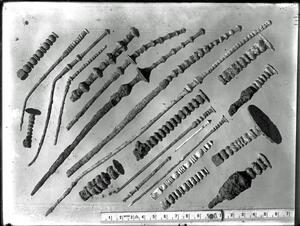 Part of the collection of images, 1906-1910, of the British School at Athens excavations at Sparta, Laconia. The original description in the SPHS register reads: "Sparta: bronze pins".