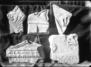 Part of the collection of images, 1906-1910, of the British School at Athens excavations at Sparta, Laconia. The original description in the SPHS register reads: "Sparta, Orthia site. Five fragments of siclke-dedication, showing ornament of stelai".