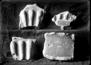 Part of the collection of images, 1906-1910, of the British School at Athens excavations at Sparta, Laconia. The original description in the SPHS register reads: "Sparta, Orthia Site 1906-10. Architectural terracottas: four pieces with tongue-pattern above".