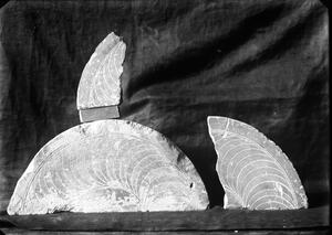 Part of the collection of images, 1906-1910, of the British School at Athens excavations at Sparta, Laconia. The original description in the SPHS register reads: "Sparta, Orthia Site 1906-10. Architectural terracottas: six pieces of disc acroterion with scale-pattern".