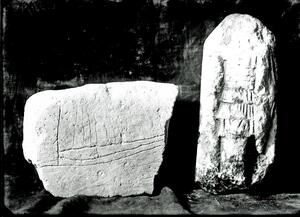 Part of the collection of images, 1906-1910, of the British School at Athens excavations at Sparta, Laconia. The original description in the SPHS register reads: "Sparta, Orthia site (1906-10). Limestone slab with drawing of ship, a marble relief of Trophy".