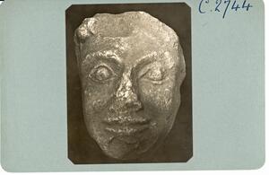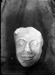 Part of the collection of images, 1906-1910, of the British School at Athens excavations at Sparta, Laconia. The original description in the SPHS register reads: "Sparta, Orltia Site. Archaic female head in grey marble (found in 1908)".
