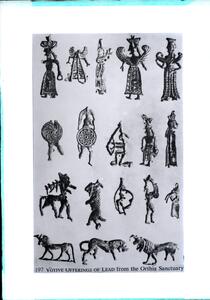 Part of the collection of images from the 1936 Exhibition of Minoan Civilization and the first 50 years work of the BSA at Burlington House, London. The object is from the 1906-1910 British School at Athens excavations at Sparta, Laconia. The original description in the SPHS register reads: "Lead figuines from the Orthia site, Sparta".