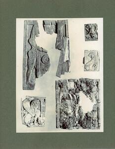 Part of the collection of images, 1906-1910, of the British School at Athens excavations at Sparta, Laconia. The original description in the SPHS register reads: "Sparta, Orthia Site 1906-10. Architectural terracottas: four pieces three have large godroour in relief".