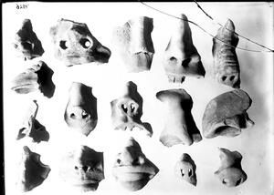 Part of the collection of images, 1906-1910, of the British School at Athens excavations at Sparta, Laconia. The original description in the SPHS register reads: "Sparta: noses of masks".