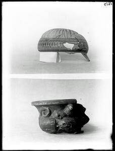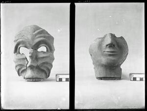 Part of the collection of images, 1906-1910, of the British School at Athens excavations at Sparta, Laconia. The original description in the SPHS register reads: "Sparta: masks, (a) mask for practical use (b) head of a leper".