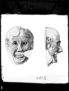 Part of the collection of images, 1906-1910, of the British School at Athens excavations at Sparta, Laconia. The original description in the SPHS register reads: "Sparta: masks, 2 views of rather conventionalised head, showing 'tattooing'".