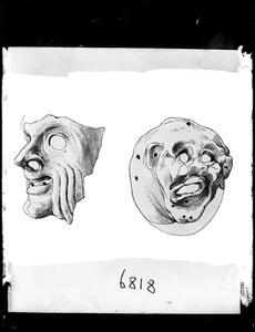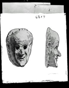 Part of the collection of images, 1906-1910, of the British School at Athens excavations at Sparta, Laconia. The original description in the SPHS register reads: "Sparta: masks, profile and front view of head of old man".