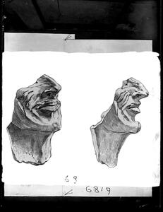 Part of the collection of images, 1906-1910, of the British School at Athens excavations at Sparta, Laconia. The original description in the SPHS register reads: "Sparta: masks, profile and front view of head with markedly protruding nose".