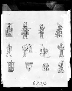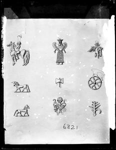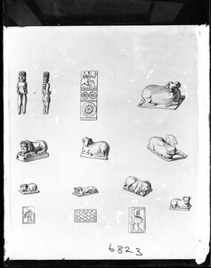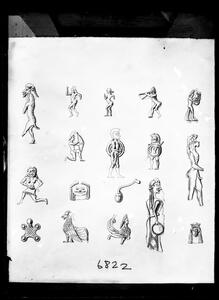 Part of the collection of images, 1906-1910, of the British School at Athens excavations at Sparta, Laconia. The original description in the SPHS register reads: "Sparta: figurines, ivory, men, animals, decorative forms".