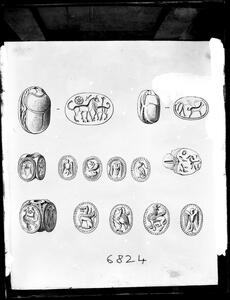 Part of the collection of images, 1906-1910, of the British School at Athens excavations at Sparta, Laconia. The original description in the SPHS register reads: "Sparta: seals and scarabs".