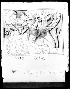 Part of the collection of images, 1906-1910, of the British School at Athens excavations at Sparta, Laconia. The original description in the SPHS register reads: "Sparta: relief in ivory. Hero between two monsters".