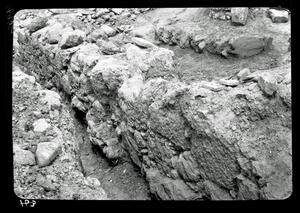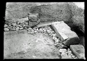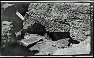 Part of the collection of images, 1924-1927, of the British School at Athens excavations at Sparta, Laconia. The original description in the SPHS register reads: "Sparta, 1924, Sanctuary on the Acropolis. Poros block of S wall & partition wall below Rom. wall".