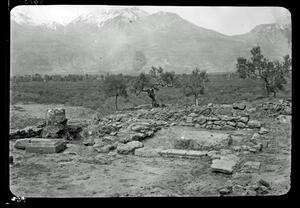 Part of the collection of images, 1924-1927, of the British School at Athens excavations at Sparta, Laconia. The original description in the SPHS register reads: "Sparta, 1924, acropolis, part of interior of Sanctuary with Poros blocks".