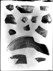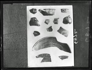 Part of the collection of images, 1906-1910, of the British School at Athens excavations at Sparta, Laconia. The original description in the SPHS register reads: "Sparta: fragments of inscribed vases".