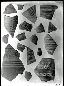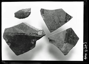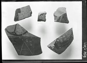 Part of the collection of images, 1906-1910, of the British School at Athens excavations at Sparta, Laconia. The original description in the SPHS register reads: "Sparta: Panathenaic amphora sherds".