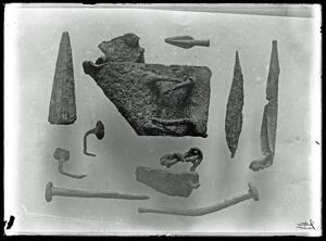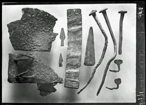 Part of the collection of images, 1906-1910, of the British School at Athens excavations at Sparta, Laconia. The original description in the SPHS register reads: "Sparta: bronze nails and plates. Chalkiaikos".