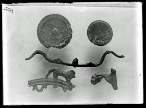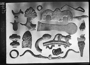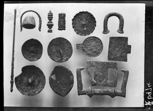 Part of the collection of images, 1906-1910, of the British School at Athens excavations at Sparta, Laconia. The original description in the SPHS register reads: "Sparta: miscellaneous bronzes. Chalkiaikos".