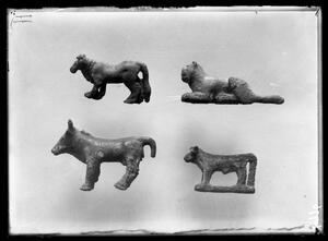 Part of the collection of images, 1906-1910, of the British School at Athens excavations at Sparta, Laconia. The original description in the SPHS register reads: "Sparta: bronzes: trumpeter (back view) & horse".