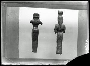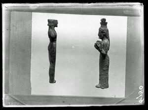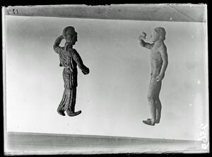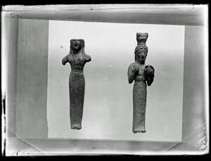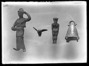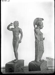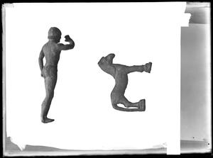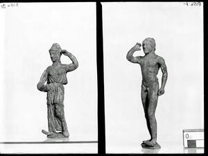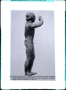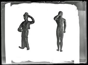 Part of the collection of images, 1906-1910 and 1924-1927, of the British School at Athens excavations at Sparta, Laconia. The original description in the SPHS register reads: "Sparta, (various years' digs). Bronze statuettes: Acropolis: Trumpeter and 5th cent. Athena".
