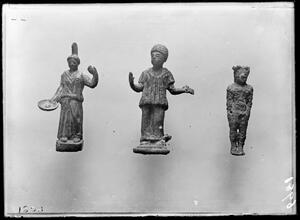 Part of the collection of images, 1906-1910, of the British School at Athens excavations at Sparta, Laconia. The original description in the SPHS register reads: "Sparta: (a) armed Aphrodite (b) trumpeter Chalkiokos".