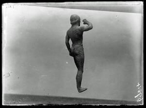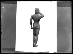 Part of the collection of images, 1906-1910, of the British School at Athens excavations at Sparta, Laconia. The original description in the SPHS register reads: "Sparta: bronzes: trumpeter (back view)".