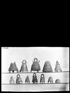 Part of the collection of images, 1906-1910, of the British School at Athens excavations at Sparta, Laconia. The original description in the SPHS register reads: "Sparta: bronze bells, Chalkiokos".