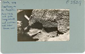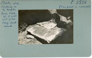 Part of the collection of images, 1924-1927, of the British School at Athens excavations at Sparta, Laconia. The original description in the SPHS register reads: "Sparta, 1924, Sanctuary on the Acropolis. Poros block of S wall & fallen bronze shield behind".