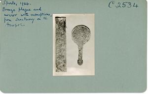 Part of the collection of images, 1924-1927, of the British School at Athens excavations at Sparta, Laconia. The original description in the SPHS register reads: "Sparta, 1924, Bronze plaque with inscription & mirror".