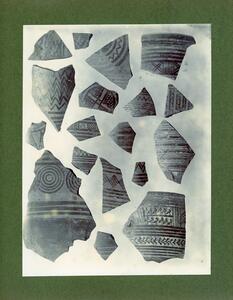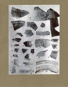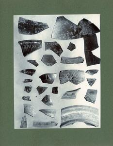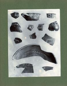 Part of the collection of images, 1906-1910, of the British School at Athens excavations at Sparta, Laconia. The original description in the SPHS register reads: "Sparta: vases, Chalciocus, inscribed sherds (B.S.A.xiii)".