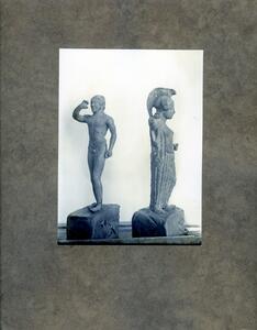 Part of the collection of images, 1906-1910 and 1924-1927, of the British School at Athens excavations at Sparta, Laconia. The original description in the SPHS register reads: "Sparta, (various years' digs). Bronze statuettes: Acropolis: Trumpeter and 5th cent. Athena".