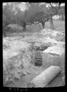 Part of the collection of images, 1924-1927, of the British School at Athens excavations at Sparta, Laconia. The original description in the SPHS register reads: "Sparta 1926, Byzantine Church Acropolis. Falen column, and triglyph-block built in".