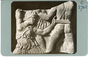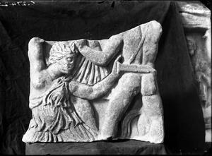 Part of the collection of images, 1924-1927, of the British School at Athens excavations at Sparta, Laconia. The original description in the SPHS register reads: "Sparta, 1925. Acropolis. Fragment of Amazonomachy-relief from Byzantine Church".