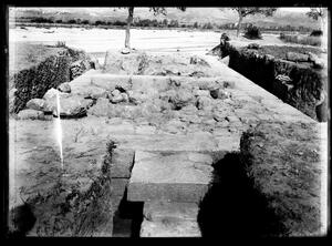 Part of the collection of images, 1906-1910, of the British School at Athens excavations at Sparta, Laconia. The original description in the SPHS register reads: "Sparta: excavations, stereobate of supposed temple near iron bridge".