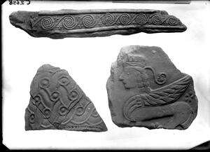 Part of the collection of images, 1924-1927, of the British School at Athens excavations at Sparta, Laconia. The original description in the SPHS register reads: "Sparta, Acropolis & Heroon. Moulded pithoi fragments; Three: one a sphinx, one a handle".