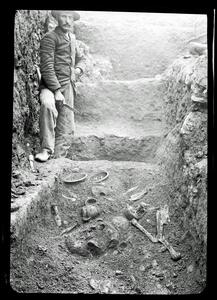 Part of the collection of images, 1906-1910, of the British School at Athens excavations at Sparta, Laconia. The original description in the SPHS register reads: "Sparta: Hellenistic tombs. B.S.A. 1907, showing vases and bones".
