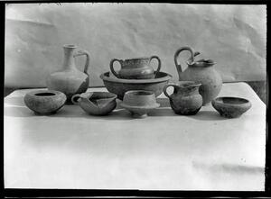 Part of the collection of images, 1906-1910, of the British School at Athens excavations at Sparta, Laconia. The original description in the SPHS register reads: "Sparta: Hellenistic vases and lamps".