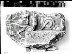Part of the collection of images, 1906-1910, of the British School at Athens excavations at Sparta, Laconia. The original description in the SPHS register reads: "Sparta: inscriptions, lower part of funerary relief, inscrip. ΙΛΟΝ".