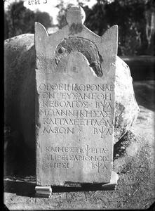Part of the collection of images, 1906-1910, of the British School at Athens excavations at Sparta, Laconia. The original description in the SPHS register reads: "Sparta, Museum No. Votive inscription with wreath & palm".