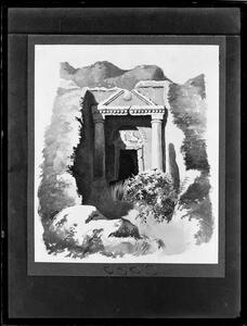 Part of a group of images from the 1891 travels of Hogarth and Munro in Anatolia as described in Hogarth's 1896 book, A Wandering Scholar in the Levant. The original description in the SPHS register reads: "Ayazeen: tomb facade another view".